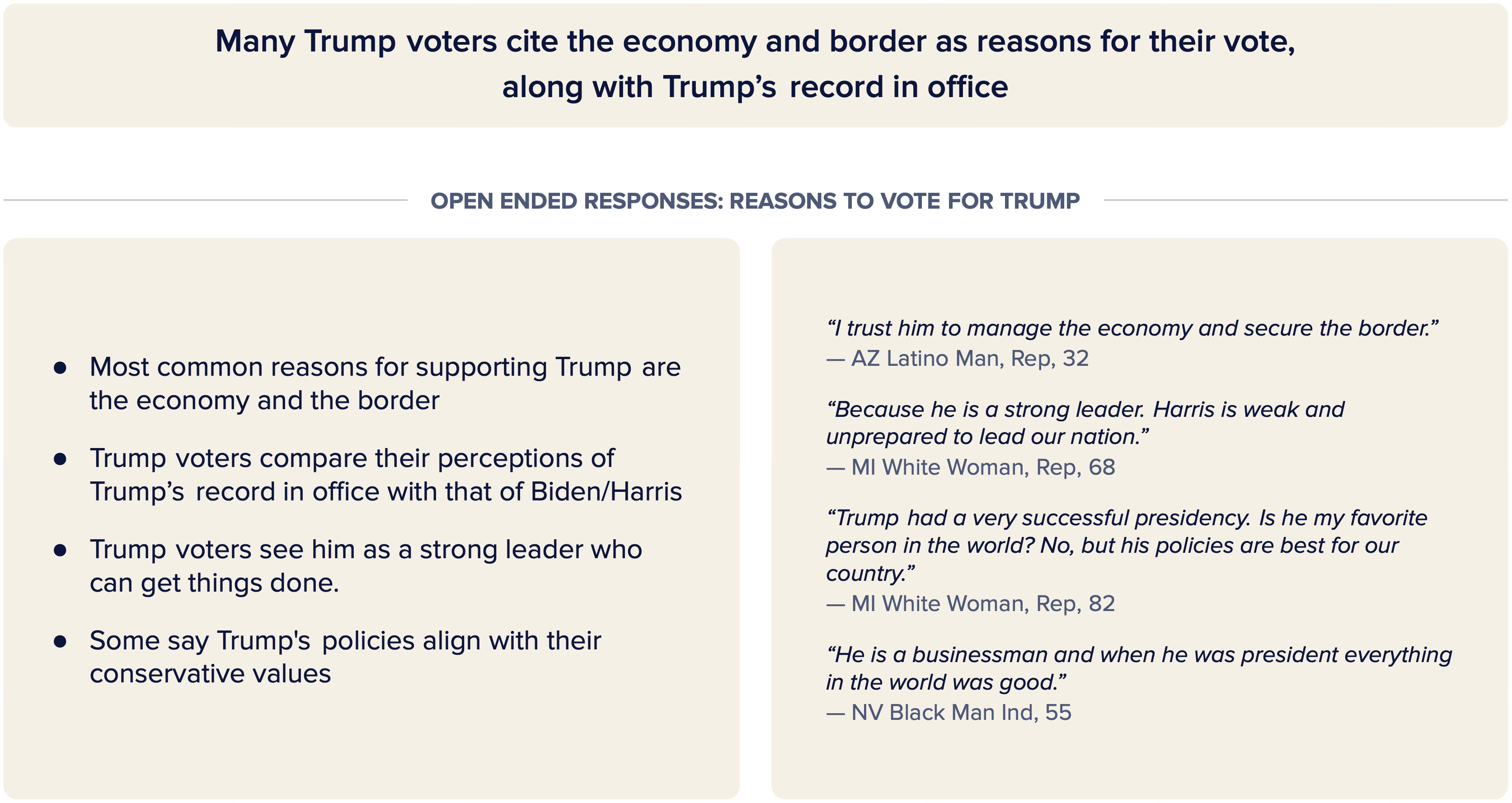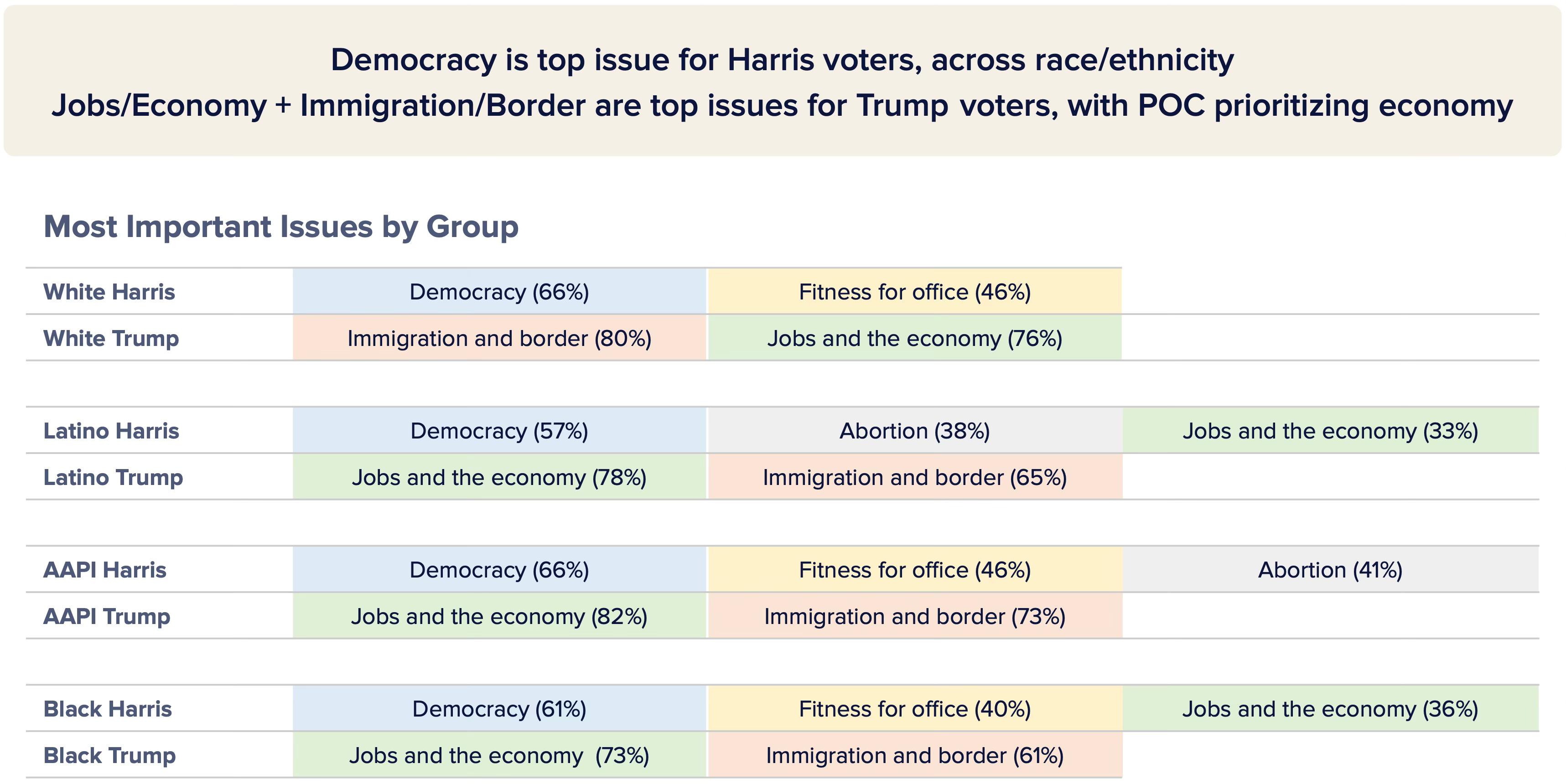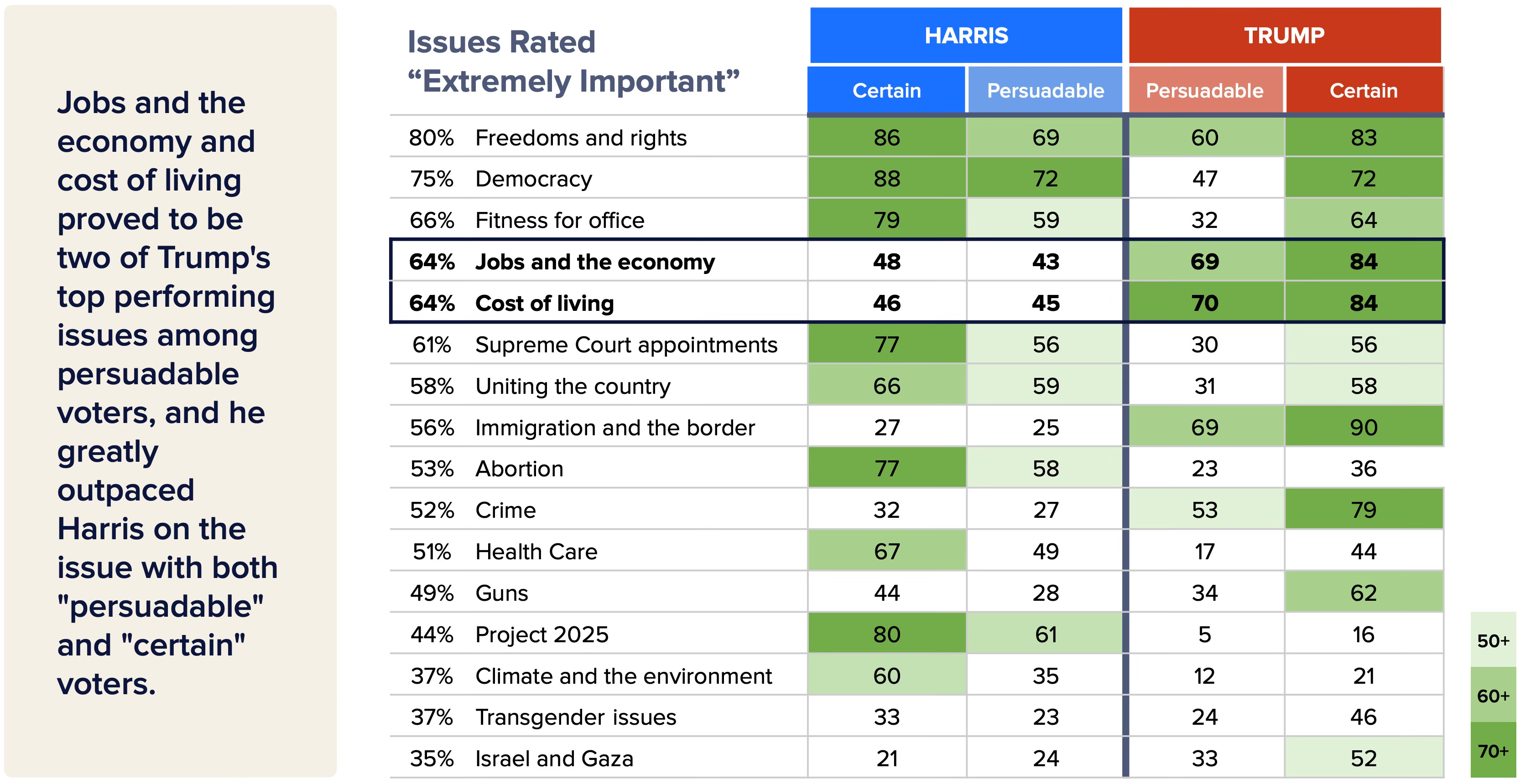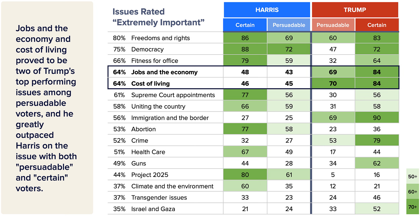 Our survey showed that among the issues battleground voters deemed most important, Harris voters were deeply motivated by democracy, freedom and rights, and fitness for office while Trump voters prioritized immigration and the border, jobs and the economy, and cost of living. Among persuadable voters in particular, Trump roundly outpaced Harris on economic and affordability issues.