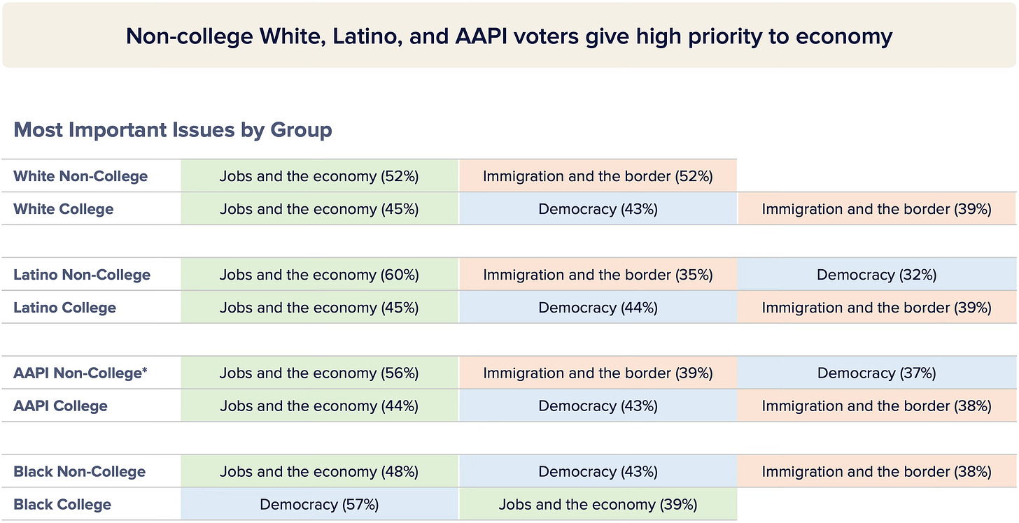 Importantly, jobs and the economy proved to be the most motivating issue across race and education. The only voters who prioritized democracy over jobs and the economy were college-educated Black voters. Non-college Black voters along with college and non-college white, Latino, and AAPI voters all centered jobs and the economy as their top issue.