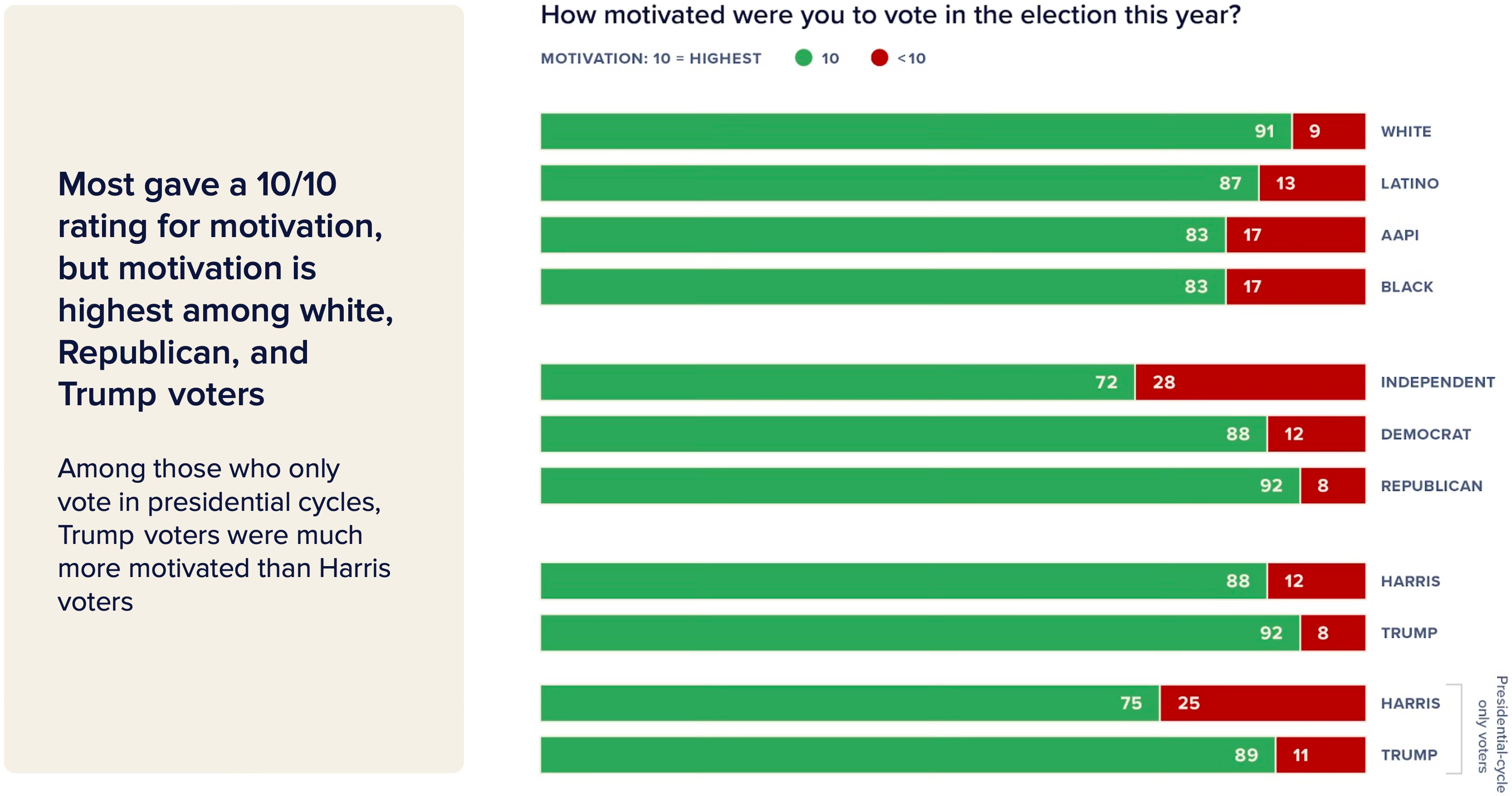 Trump voters reported being more motivated by a 4-point margin, 92% - 88%, with motivation being higher among Trump-leaning groups such as white and Republican voters. White voters, for instance, were 8 points more motivated at 91% than Black and AAPI voters at 83% each. And among those who only vote in presidential cycles, Trump voters reported being more motivated to vote by a 14-point margin (89% - 75%); he also held a 6-point advantage in enthusiasm among new voters.