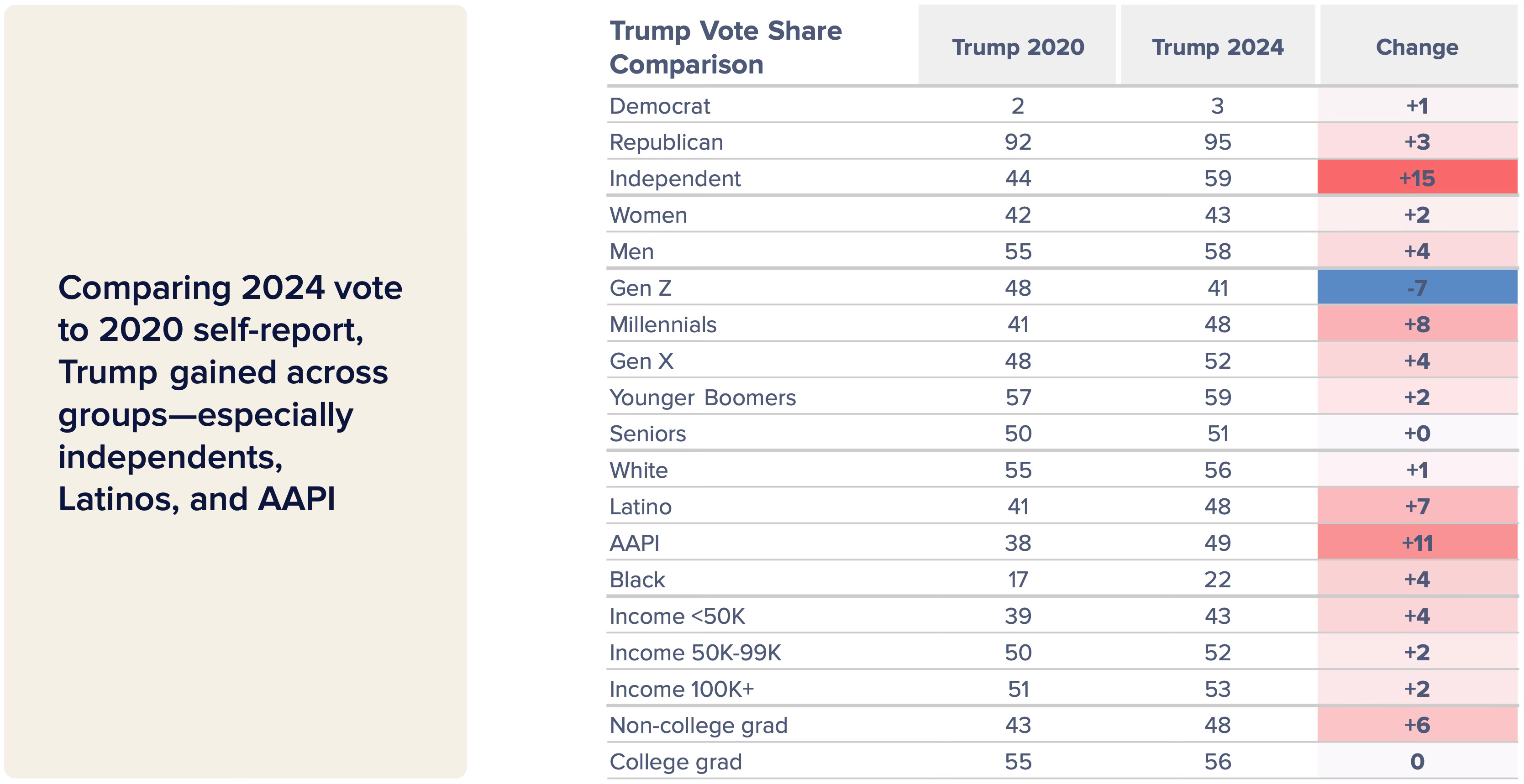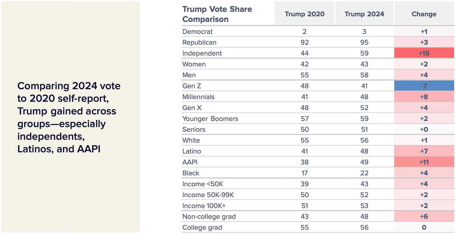 Indeed, comparing Trump’s 2020 to 2024 vote share (using participants’ self-reporting), he increased support across a stunning array of groups, posting significant gains among Independents (+15), AAPI voters (+11), Millennials (+8), and Latinos (+7), though Harris still won Millennials and Latinos outright.