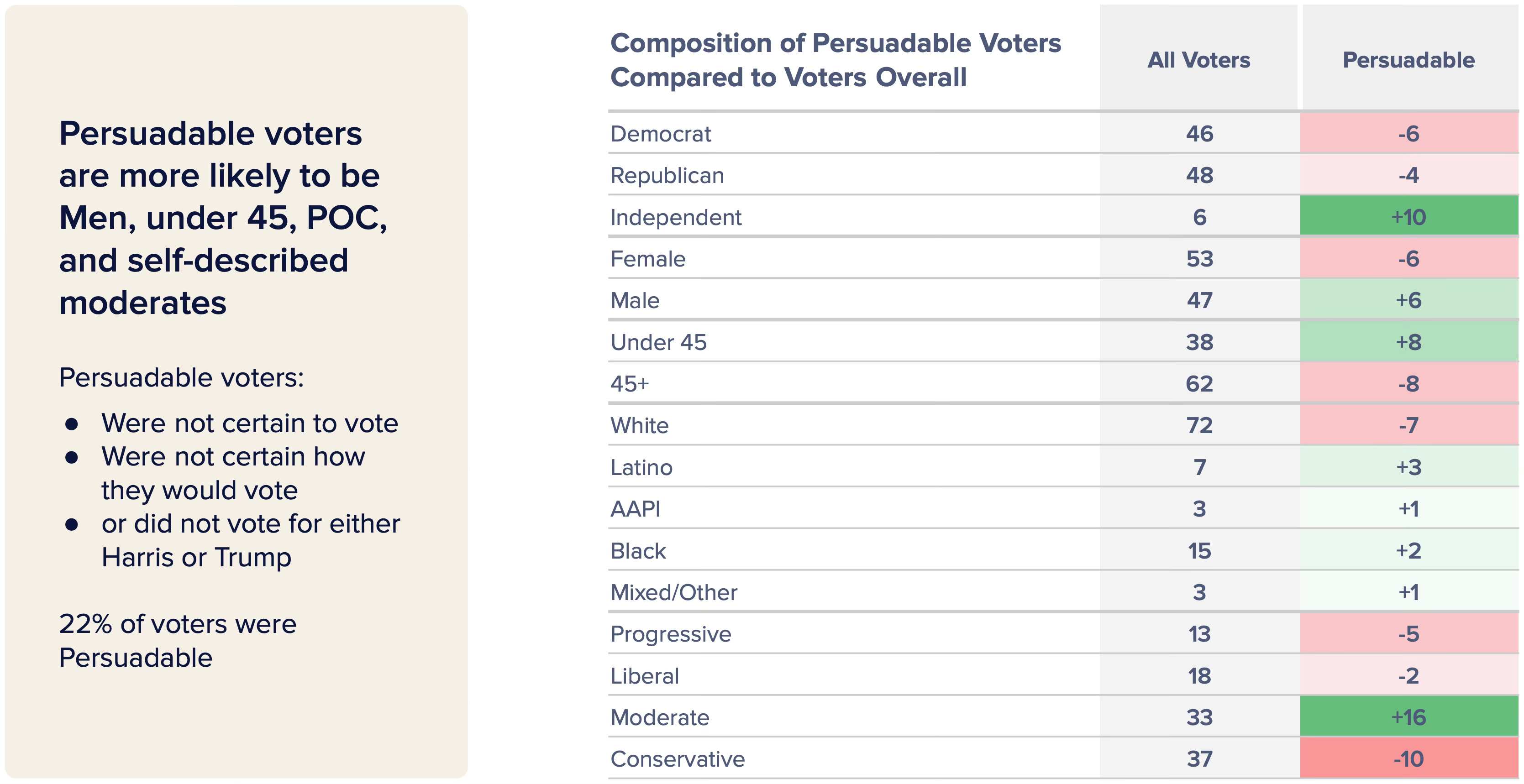 Among the most persuadable voters were moderates (+16 points more likely to be persuadable than voters overall), Independents (+10), under 45 voters (+8), men (+6), and voters of color (Latino +3, Black +2, AAPI +1, and mixed race race +1).