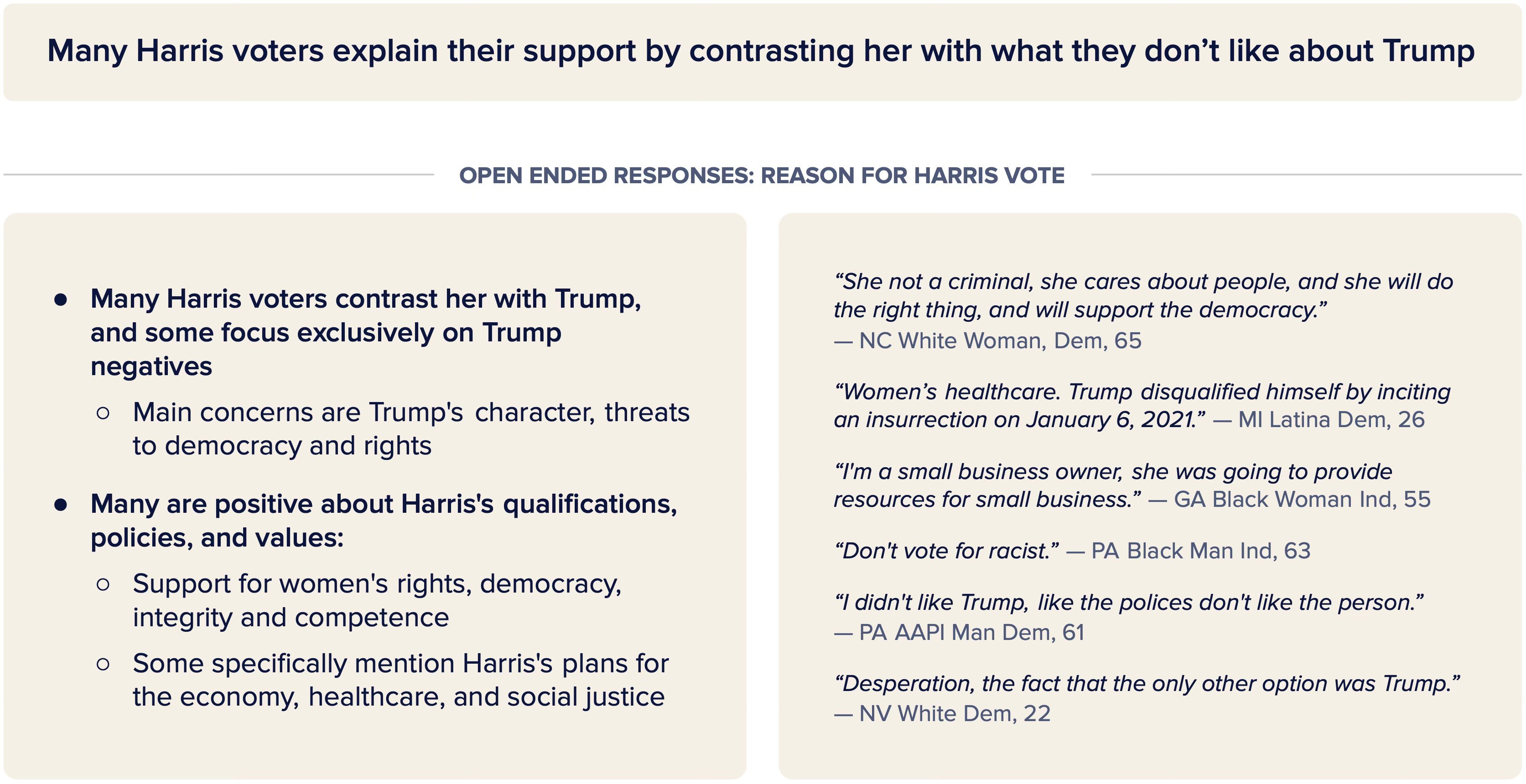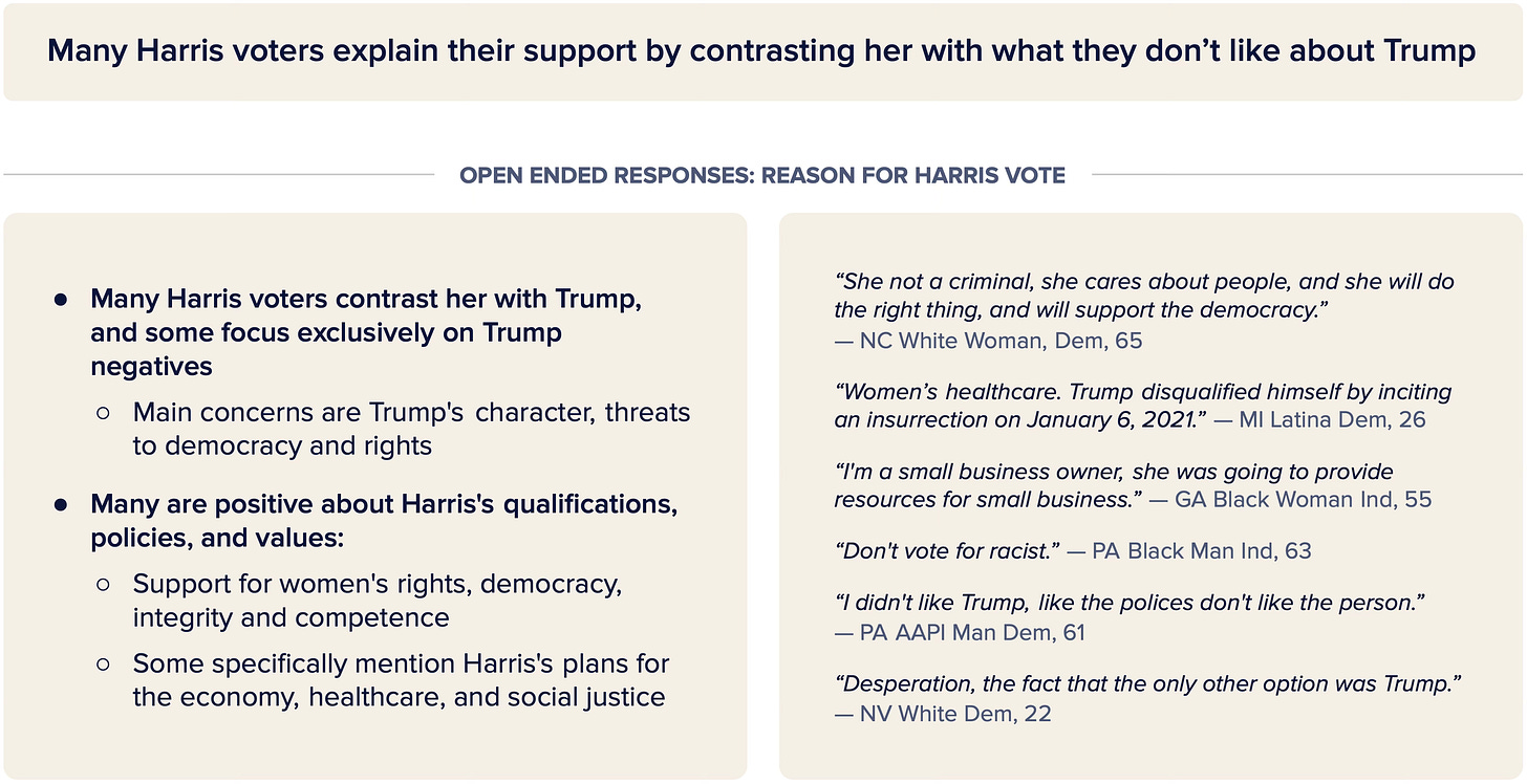 In open-ended responses in the survey, the main reason Harris persuadables voted for her was the same reason Harris voters chose her overall: Trump.