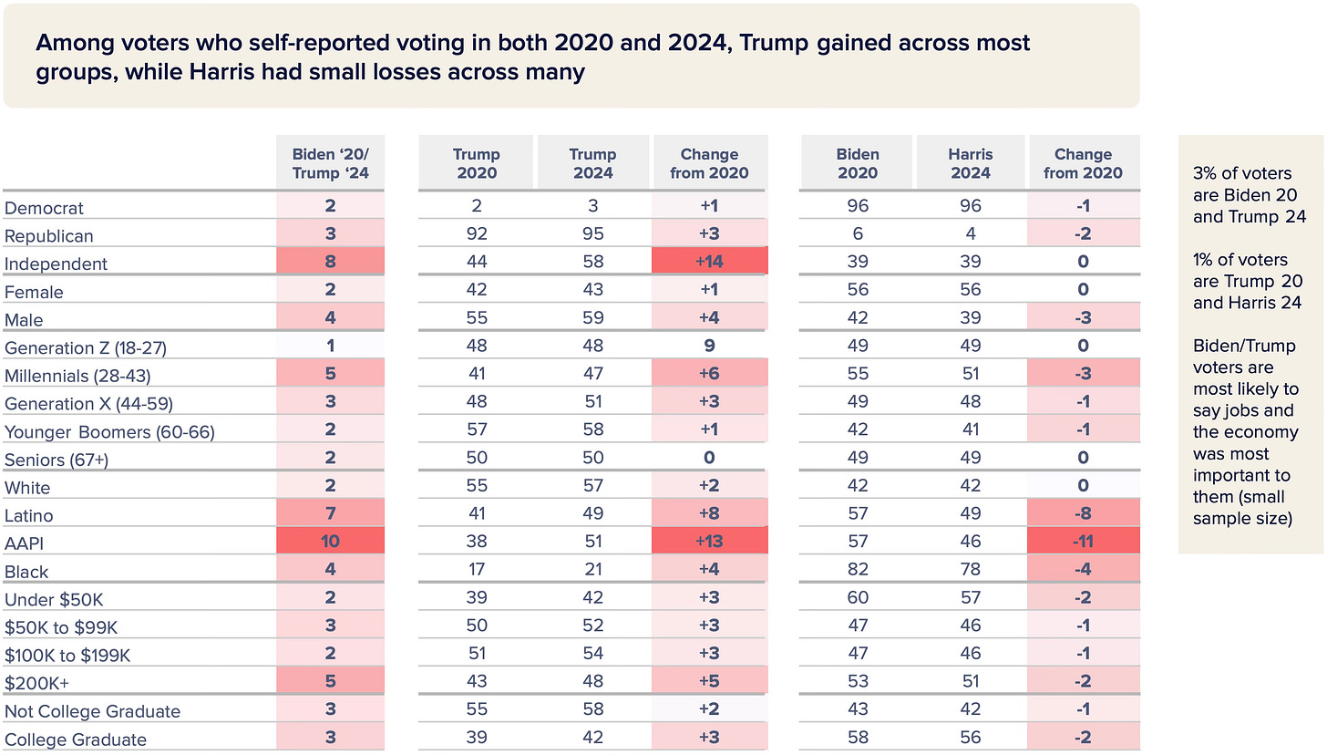 Among voters who self-reported voting in both 2020 and 2024, 3% said they shifted their vote from Biden 2020 to Trump 2024, while only 1% said they defected from Trump 2020 to Harris 2024. Trump made small gains across nearly all groups while Harris either stagnated or lost votes. Harris’ erosion was particularly pronounced among voters of color.
