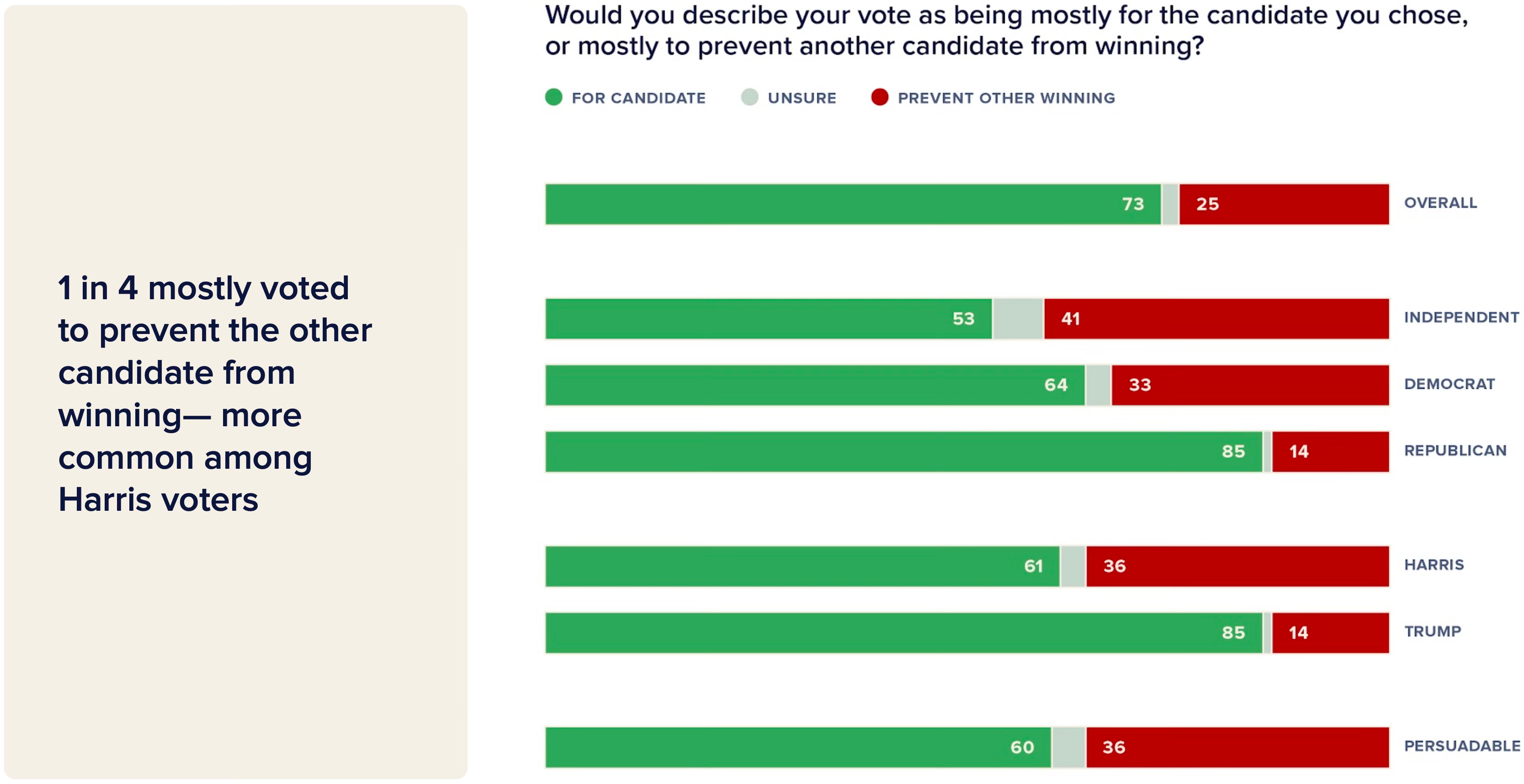 More Harris voters said they voted primarily to cast a ballot against Trump, while many Trump voters said they affirmatively voted for their candidate, with just 61% of Harris voters describing their choice as being “mostly for” the candidate versus 85% of Trump voters who said the same. A little over a third of Harris voters said they cast a ballot to prevent another candidate from winning—less than half as many Trump voters (14%) said the same.