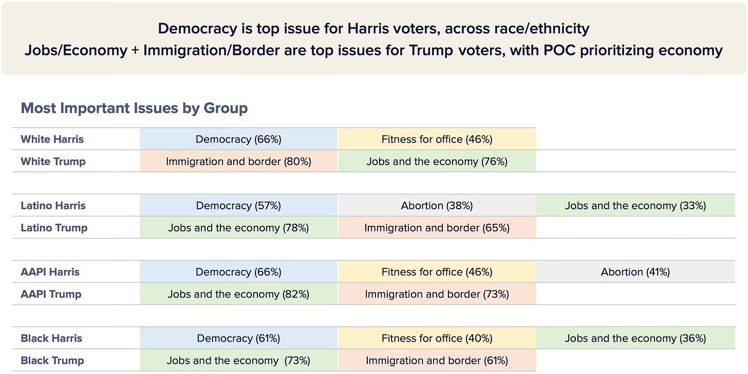 And while white Trump voters named immigration and the border as their top issue, Trump voters of color (Black, Latino, and AAPI) overwhelmingly prioritized jobs and the economy. Across race, Harris voters almost uniformly prioritized democracy, but she fell short on the economic battle, which is where the contest was won and lost.