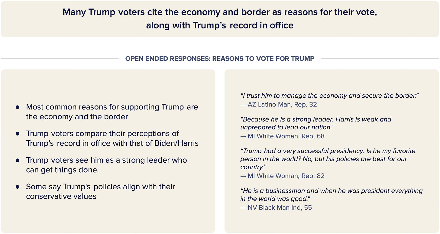 The main reason Trump persuadables voted for him was, similarly, Harris, but overall Trump’s voters said they were motivated by the economy and border security.